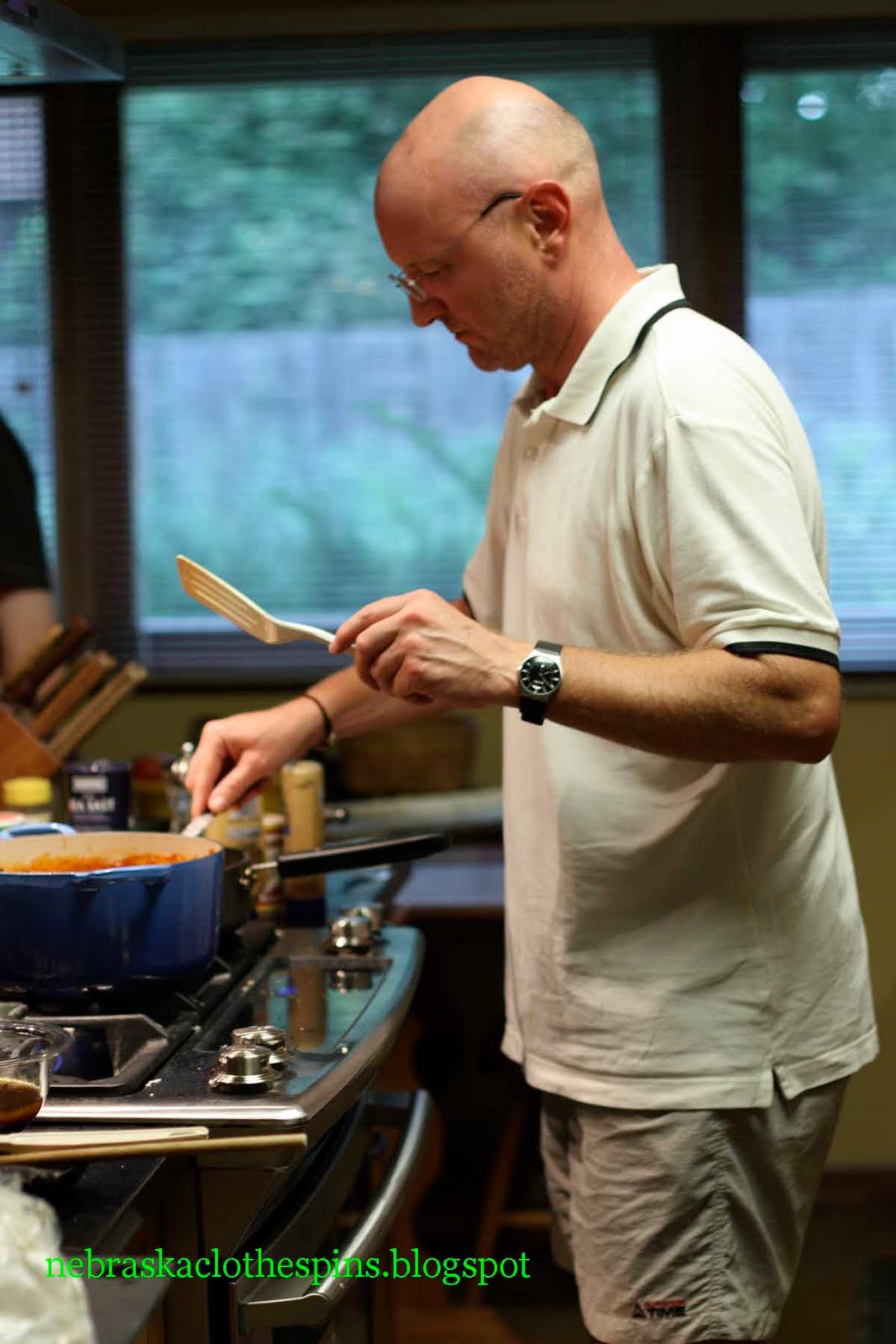 Finally he mixed the pasta & sauce together into one large pot.